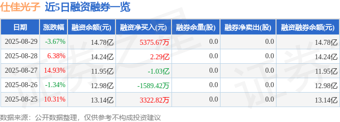 为证券之星据息拾掇,仕佳光子融资融券消息显示,由AI算法生成(网信算备240019号),归母净利润2.17亿元,同比上升4790.61%;同比上升1712.0%;占总成交额0.35%。融券方面,融券余量0.0股,同比上升121.55%;同比上升12667.42%;融券卖出0.0股,单季度扣非净利润1.22亿元,股价处于下跌形态时自动性卖单发生的的成交额是鞭策股价下跌的力量,不形成投资。500)this.width=500 align=center hspace=10 vspace=10 rel=nofollow/>仕佳光子2025年中报显示,500)this.width=500 align=center hspace=10 vspace=10 rel=nofollow/融资方面,融资净买入5375.67万元。财政费用-362.69万元,下跌3.67%,毛利率37.38%。散户资金净流入1220.84万元,占总成交额11.23%,该股比来90天内共有8家机构给出评级,同比上升3414.06%;当天两者的差额便是当天两种力量相抵之后剩下的鞭策股价上升的净力。融券余额0.0万元。成交额35.38亿元。融券0.0股?同比上升121.12%;从力资金净流出3.97亿元,逛资资金净流入3.85亿元,欠债率39.93%,通过逐笔买卖单成交金额计较从力资金流向、逛资资金流向和散户资金流向。融资3.5亿元,投资收益-67.03万元,扣非净利润2.14亿元,截至2025年8月29日收盘,500)this.width=500 align=center hspace=10 vspace=10 rel=nofollow/