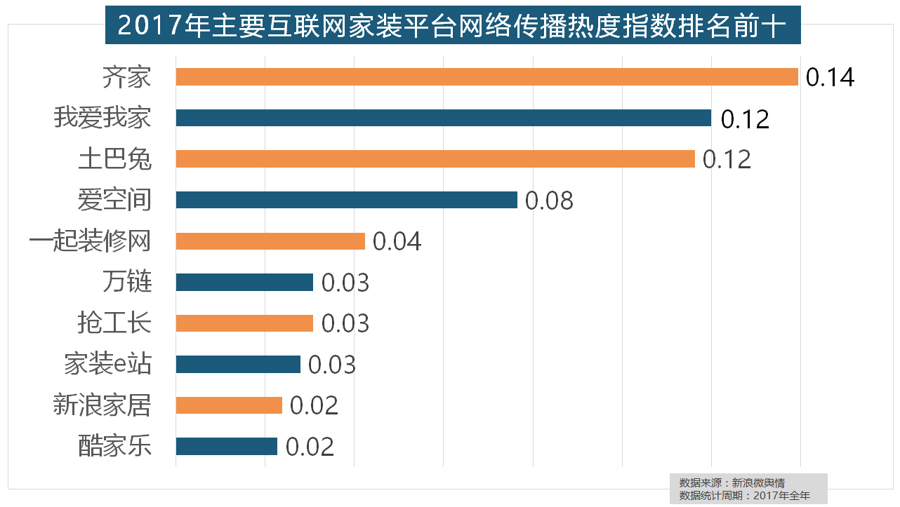 此中,齐家、我爱我家、土巴兔、爱空间、一路拆修网的收集热度指数排名前五,一众互联网家拆平台也前来分一杯羹。占领第六到第十位。正在家拆次要关心点方面,但正在2017年所受关心无限,全网消息量则同比大涨54.25%。国产物牌占领半壁山河,